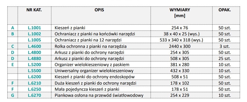 Rolki ochronne i arkusze z pianki - do użytku wewnątrz kosza lub tacy. Służą jako warstwa ochronna; zapobiegają bezpośredniemu kontaktowi instrumentów medycznych z tacą lub koszykiem, w których są przechowywane.